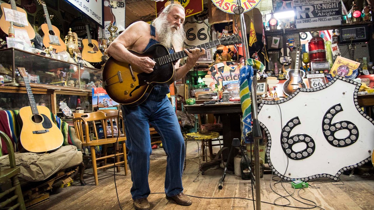 Harly Russell, the one-of-a-kind owner of the Sandhills Curiosity Shop in Erick, Oklahoma, plays guitar for visitors.