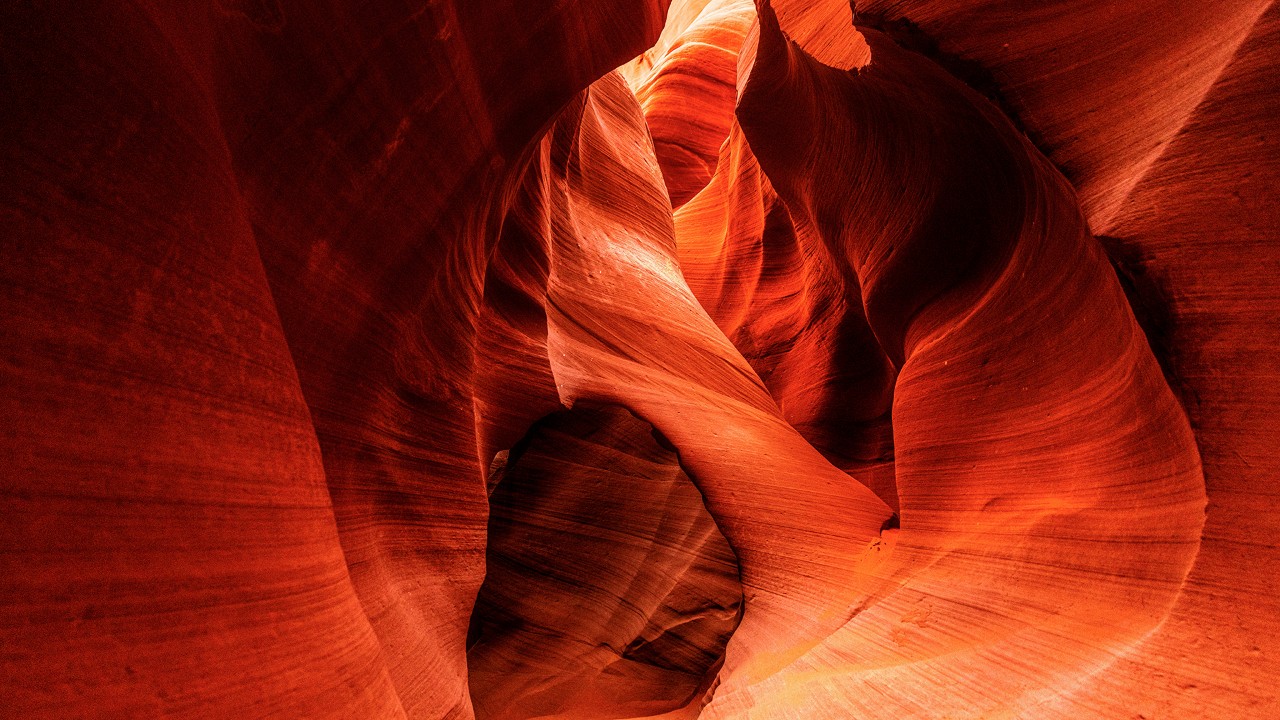 Another spot where timing and lighting dramatically change the nature of photos is Antelope Canyon, a slot canyon just 6.5 miles east of Horseshoe Bend. Functioning like a reverse sundial, the narrow canyon walls allow only a sliver of light to penetrate the dark chasm throughout the day. But as the sun moves higher into the sky, the light reaches farther into the canyon’s depths.